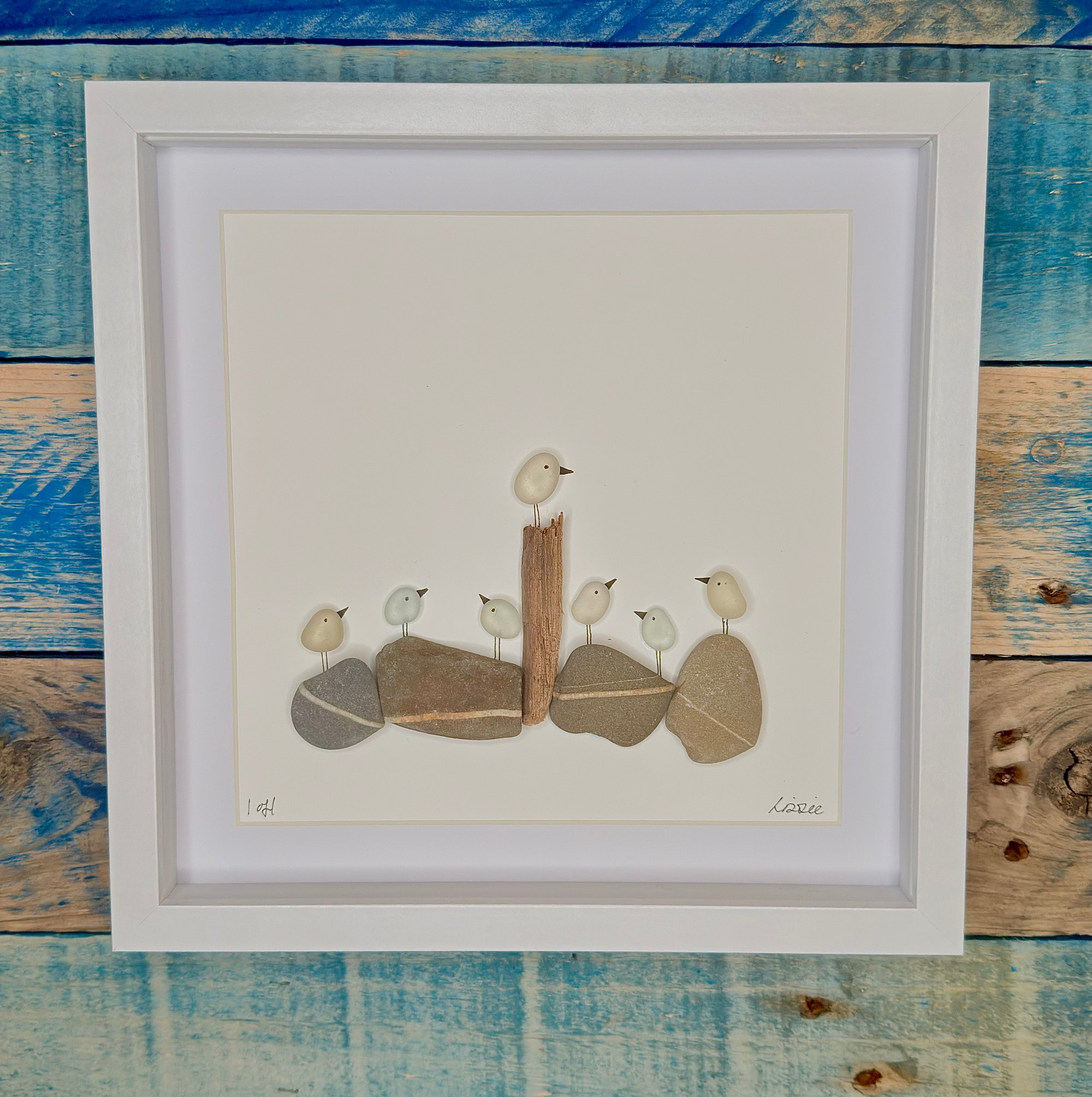 seaglass birds on beach pebbles and driftwood