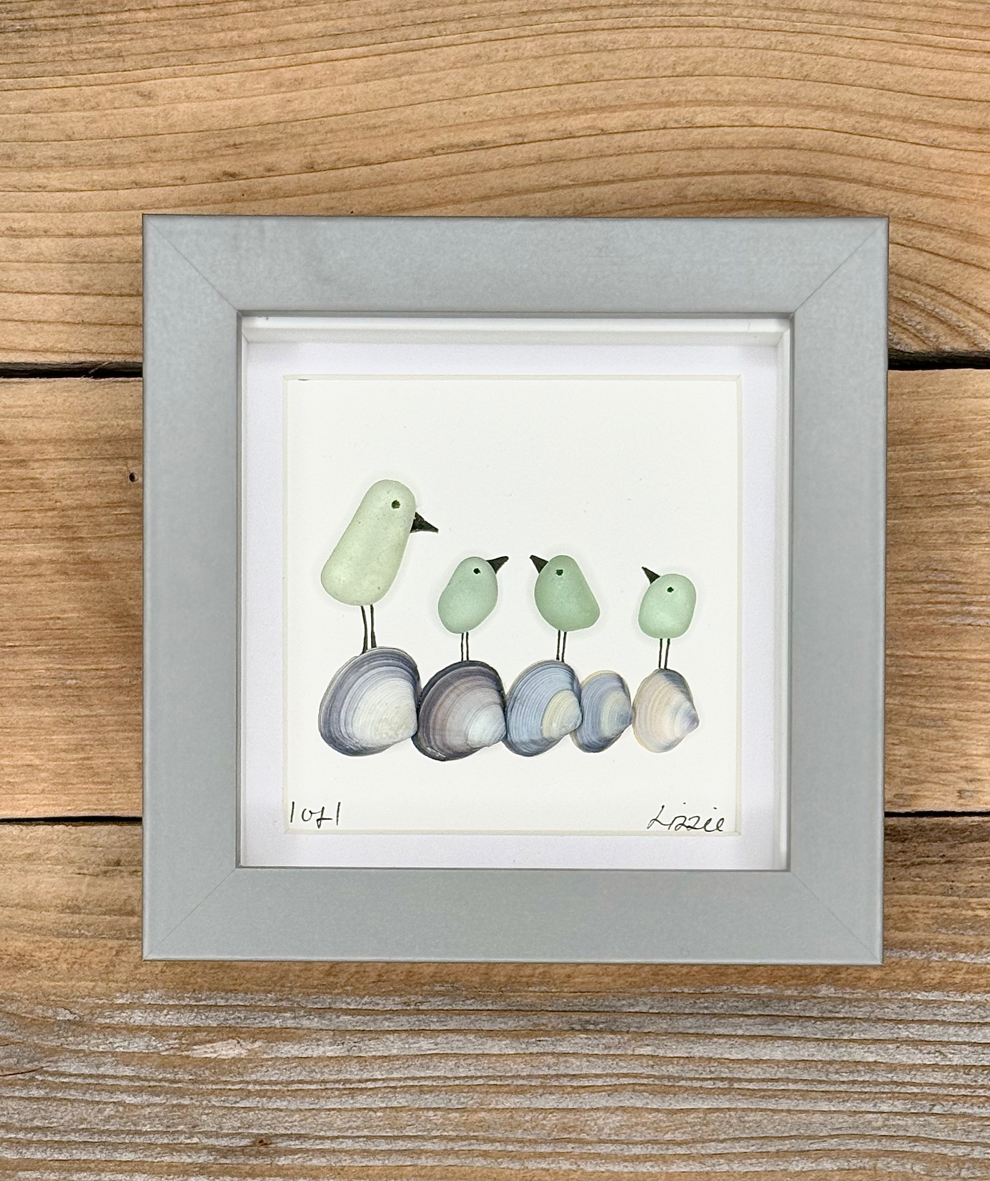 Seaglass birds on mini shells